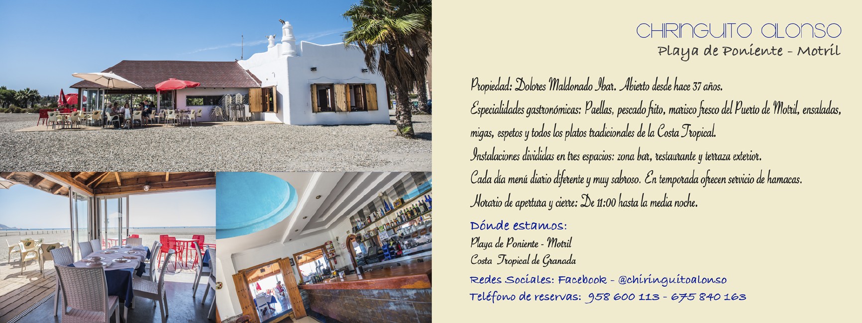 Especialidad gastronómica: Paellas, pescado frito, marisco fresco del Puerto de Motril. Ensaladas, migas, espetos y todos los platos tradicionales de la Costa Tropical.