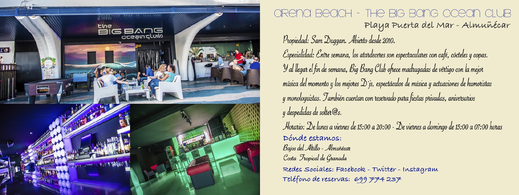 Especialidad: Entre semana, los atardeceres son espectaculares con café, cócteles y copas. Y al llegar el fin de semana, Big Bang Club ofrece madrugadas de vértigo con la mejor música del momento y los mejores D’js.