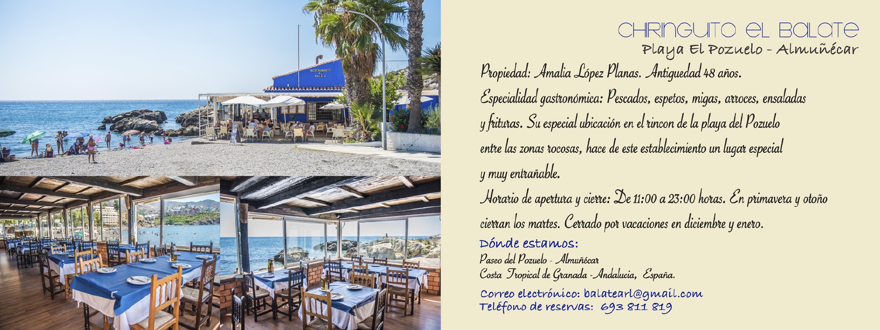 Su especial ubicación en el rincón de la playa del Pozuelo, entre las zonas rocosas, hace de este establecimiento un lugar especial y muy entrañable.