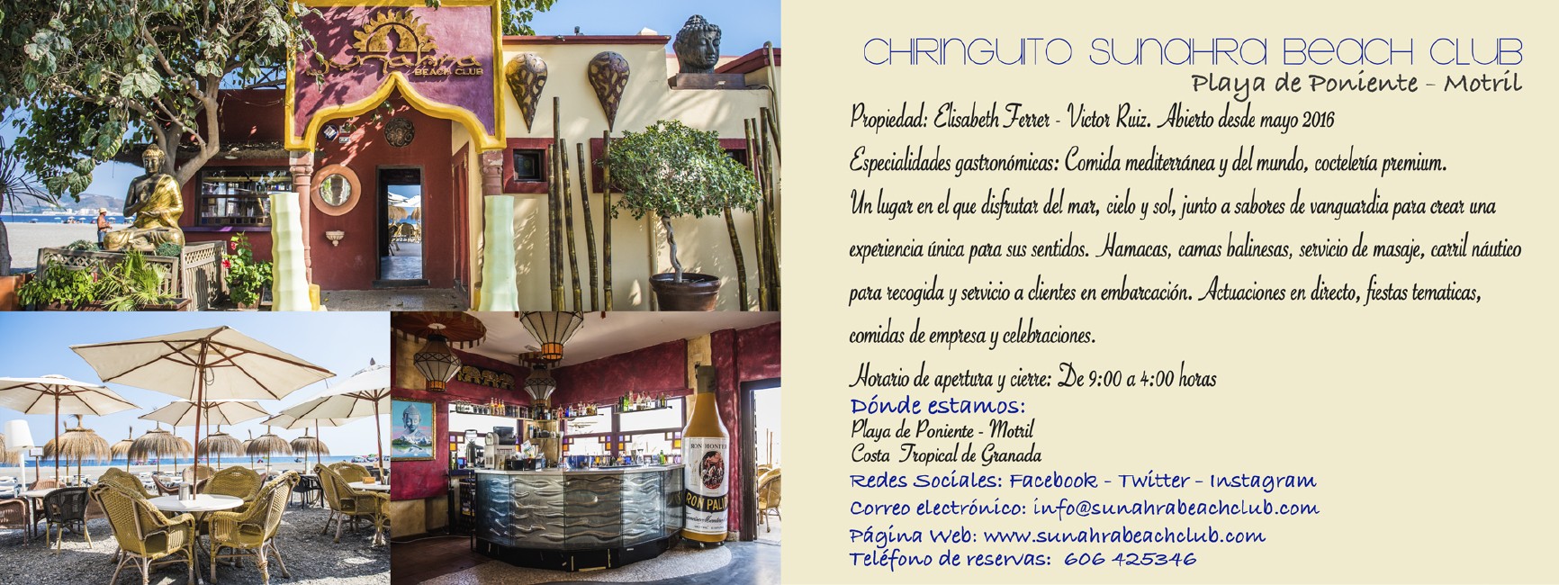 Servicios que ofrecemos: Cocteleria Premium, comida mediterránea y del mundo. Hamacas, camas balinesas, servicio de masaje, carril náutico para recogida y servicio a clientes en embarcación. Actuaciones en directo, fiestas temáticas, comidas de empresa y celebraciones…